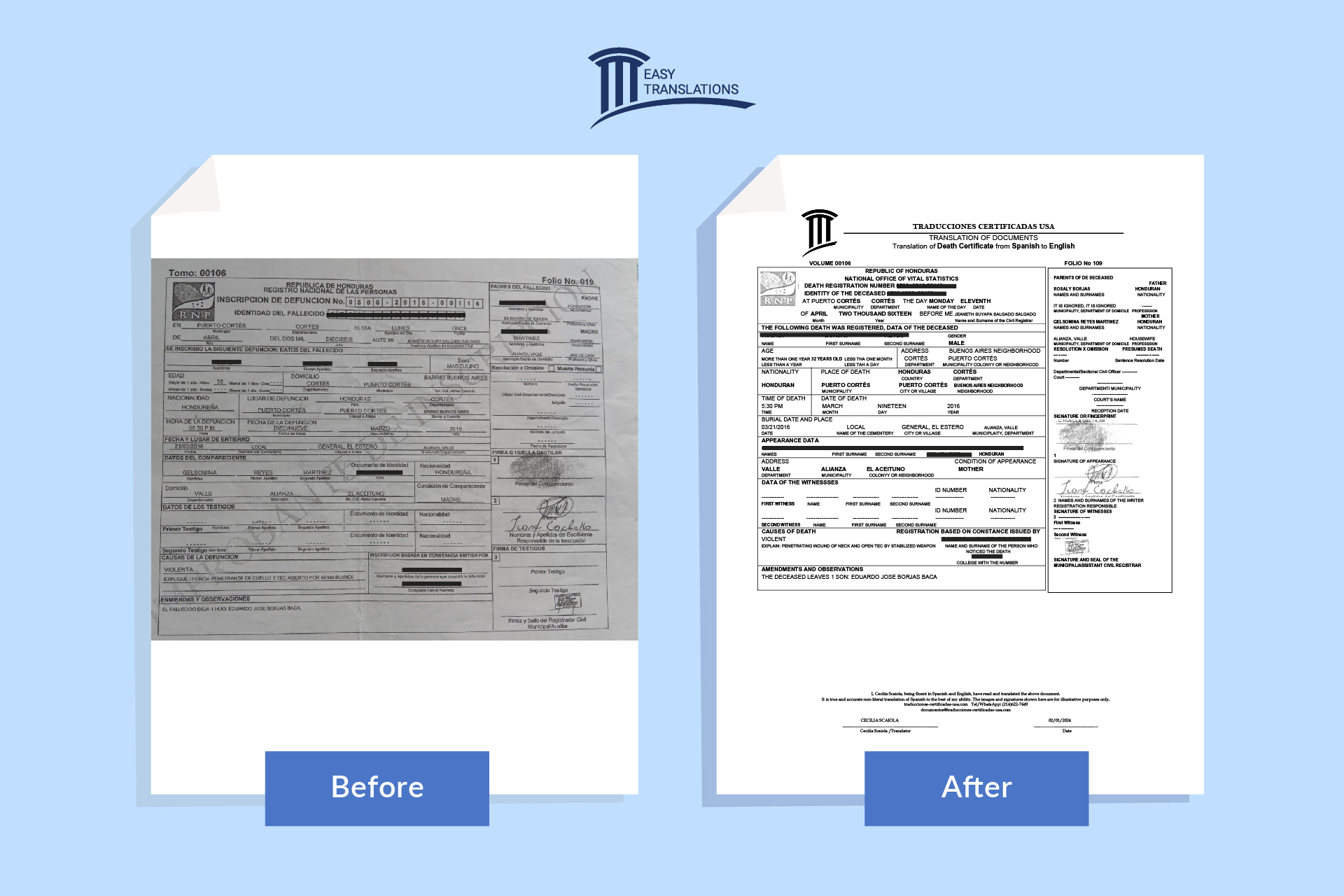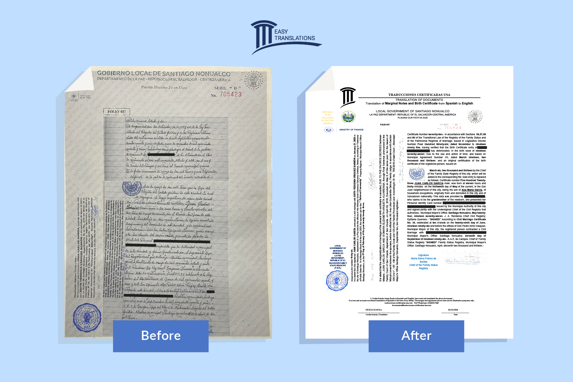 We will deliver your translated, signed, and certified document in express PDF format. We will do our best to preserve the original design and layout as much as possible. Below, you can see some examples of our certified translations.